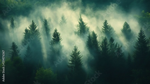 Misty forest landscape with fog covering evergreen trees