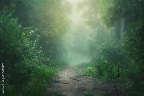 Misty Forest Path with Soft Light and Depth of Field