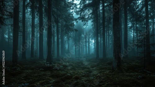 Misty forest scene with tall trees and an ethereal atmosphere during twilight hours