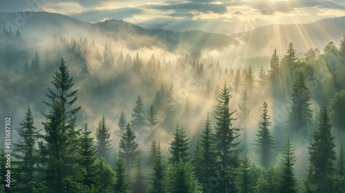 Misty forest with clouds and fog above pine trees and distant horizon featuring rays of light