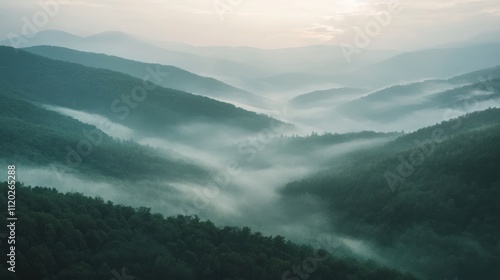 Misty forested mountain valleys at dawn with layers of fog
