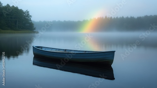Misty lake morning with a solitary boat and a soft rainbow reflecting on calm waters