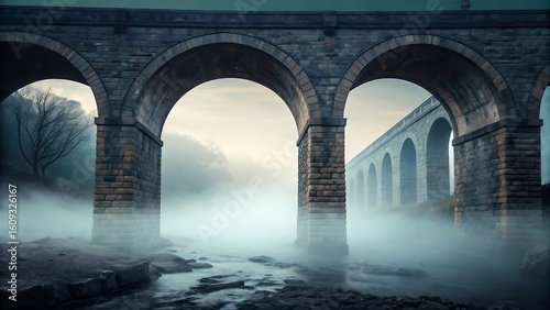 Misty morning river flows under ancient stone railway viaduct arches