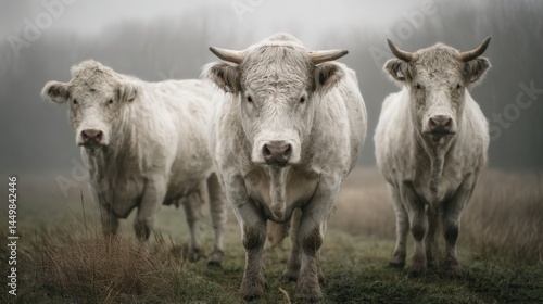 Misty Morning Trio: Majestic White Charolais Cattle in Serene Pasture