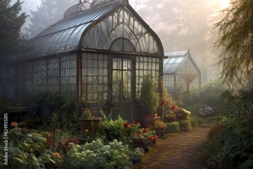 misty morning view of victorian greenhouse in garden, created with generative ai