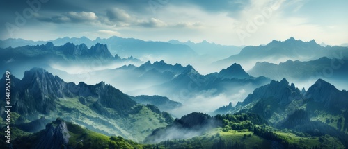 Misty mountain ridge with a panoramic view of surrounding peaks and valleys