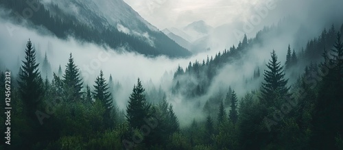 Misty mountains rise in the background, layered in fog with dense green forest in the foreground creating a serene atmospheric landscape.