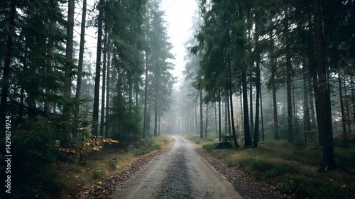 Misty Path Through Forest Trees In Foggy Woodland, Tall Pines and Foliage Trail