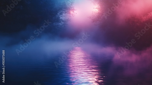 Misty pathway with vibrant reflections on water under a dark blue backdrop, creating a solitary atmosphere enhanced by neon lights and radiant rays.