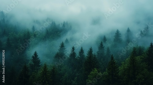 Misty pine forest offers a serene view, with towering trees shrouded in a veil of soft fog.