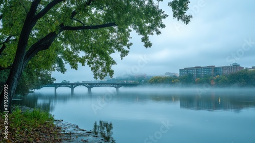 Misty River Landscape with Fog and Overcast Skies Enhancing Natural Serenity and Calmness