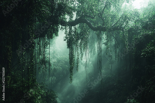 Misty tropical rainforest filled with towering trees and hanging vines on a tranquil morning