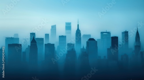 Misty urban skyline of modern city skyscrapers at dawn