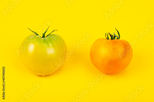 Mix of ripe colorful tomatoes on bright yellow background. Studio Photo