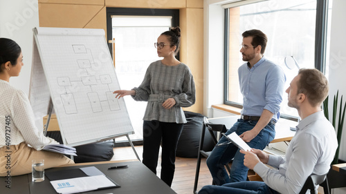 Mix raced female project leader presenting plan to team at corporate meeting. Office coach explaining marketing graph on flip chart to employees or interns at workshop. Business training concept