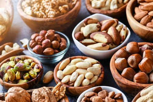 Mixed nuts in wooden bowls on black stone table. Almonds, pistachio, walnuts, cashew, hazelnut. Top view nut photo.
