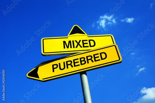 Mixed or Purebred - Traffic sign with two options - pure-blooded animal with known lineage vs crossbreeded pet. Cultivation and breeding vs crossbreeding and hybrid offspring