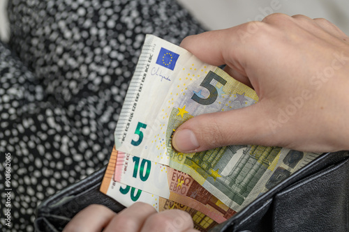 Młoda dziewczyna wymienia pieniądze na euro i chowa banknoty do portmonetki,