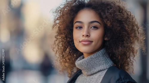 Młoda kobieta z kręconymi włosami stoi na ulicy w mieście, otoczona architekturą urbanistyczną