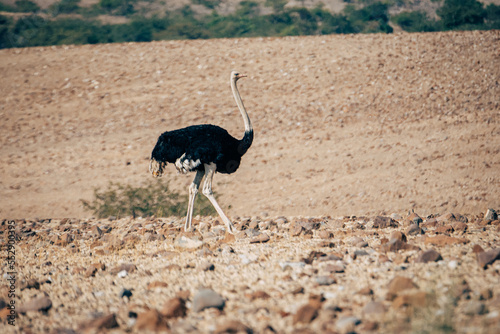 Männlicher Afrikanischer Strauß (struthio camelus) stolziert über die Trockensavanne, Kaokoveld, Namibia