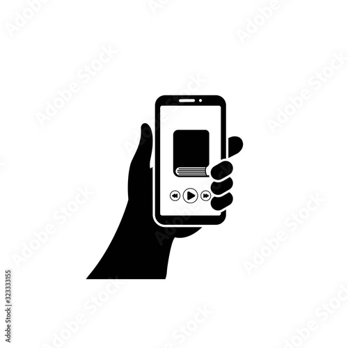 Mobile phone in hand icon vector illustration isolated on white background. Listening audio book in phone