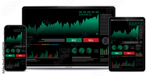 Mobile Phone, Tablet PC and Laptop Computer With Stock Market Trading Graph and Finance Screen. UI design template for black theme background.