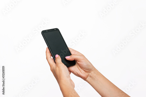 Mobile phone with black screen in female hands isolated on a white background. Blank with an empty copy space for the text. Template for the design. Mockup of a smartphone. A young woman using phone
