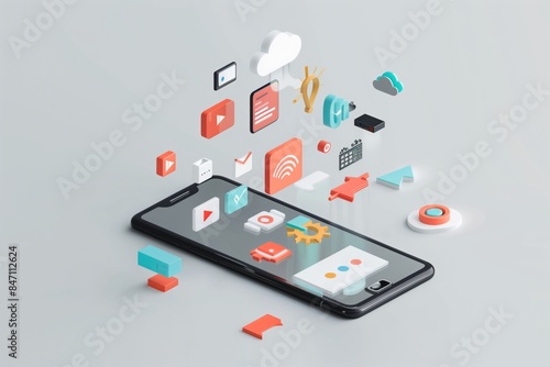 Mobile Phone with Floating Icons of Artificial Intelligence, Video, and Data on Light Grey Background Representing AI in Marketing for Virtual Events and Digital Transformation