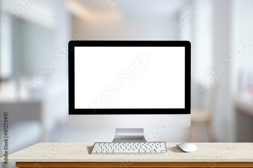 Mock up Desktop Computer on wood desk in office background. Blank screen and copy space for graphic and products display montage.