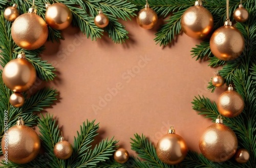 Mock up: frame of fir branches and festive Christmas balls in gold and mocha mousse. Monochrome background in trendy mocha mousse color. Empty space for text. New Year and Christmas atmosphere