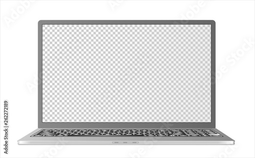 Mock up of laptop with blank transparent screen on white background with realistic shadow. Can be used as a template for your design. Vector illustration.