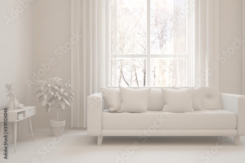 Mock up of stylish room in white color with sofa and winter landscape in window. Scandinavian interior design. 3D illustration