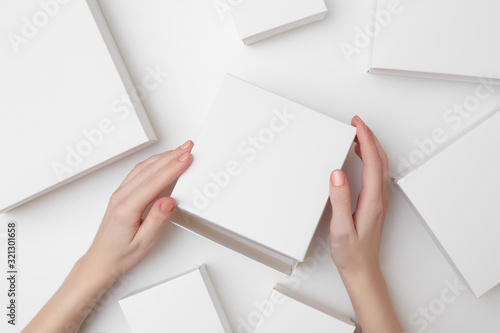 Mock up of white present box in women's hands on the white background surrounded with many different size white boxes