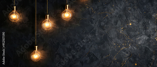 Mock up with glowing string lightning, lamp bulbs, garland on dark textured background with golden shimmer. Illumination background with lights effect. Loft. Copy space. Generative ai.