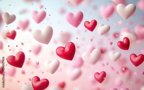 Mockup background with space for text featuring soft pink and red hearts floating on a delicate pastel gradient for Saint Valentines Day and 8 March International Womens Day