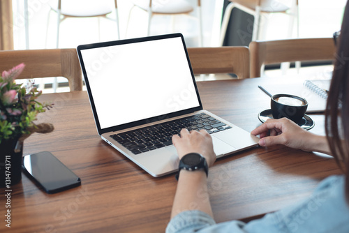 Mockup blank white screen laptop computer. Business woman using and searching the information on laptop with empty screen on wooden table in modern loft cafe.