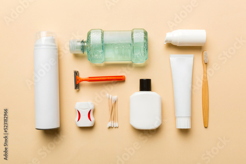 Mockup for bathing products top view flat lay, spa razor, toothpaste, soap, gel and other various accessories. Cosmetics for skin health. Bath Mockup for your logo