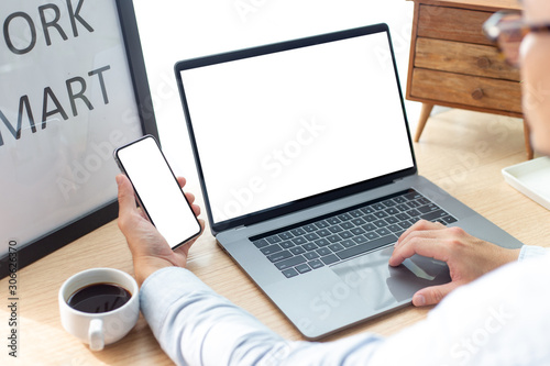 mockup image blank screen computer,cell phone with white background for advertising text,hand man using laptop texting mobile contact business search information on desk in office.marketing design