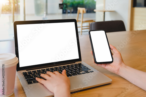 mockup image computer,cell phone blank screen for hand typing text,using laptop contact business searching information in workplace on desk at office.design creative work space on wooden desk