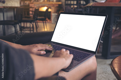 Mockup image of a woman using and typing on laptop with blank white desktop screen while sitting on a chair