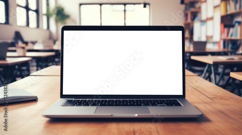 mockup image of laptop with blank transparent screen, on the table by the notebooks and textbooks in a cozy school classroom environment furnishings. Ideal for educational school and university websit