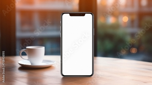 Mockup image of smartphone with blank white screen on wooden table in cafe