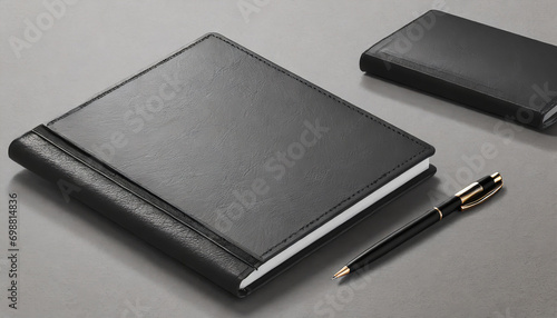 Mockup of a black diary in a leather cover with a pen and a pencil on the table without a logo. A5 notebook