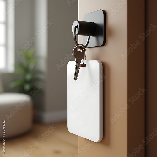 mockup of a blank acrylic keychain hanging from a set of house keys, set against a blurred background of a front door, depth of field effect