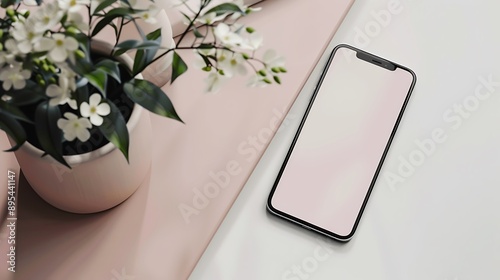 Mockup of a Modern Smartphone with White Flowers and a Pink Background