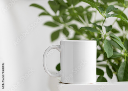 Mockup of a white tea cup or coffee mug on a white table minimalism background with a Schefflera plant. Subject template for your design, advertising with copy space