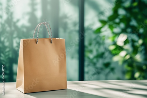 Mockup of eco-friendly kraft paper bag standing on white wooden table with minimalistic background and copy space. Concept of sustainable packaging, natural branding, and eco-conscious lifestyle.