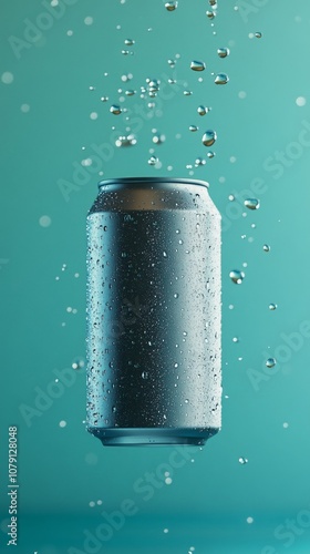 Mockup of Floating Aluminum Can with Water Droplets in Aqua Background for Fresh and Clean Beverage Branding Display