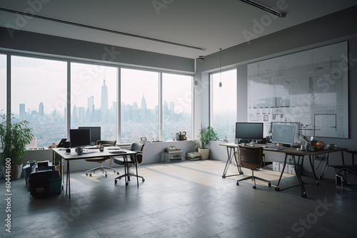 Mockup scene of office in skyscraper with big windows, big whiteboard at wall for advertising cutout - generative AI