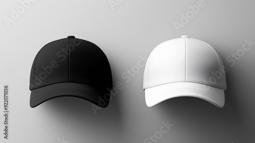 Mockup showing a black and white baseball cap side by side on a neutral background. The top-down view emphasizes the fabric texture, stitching, and design contrast between the two caps.